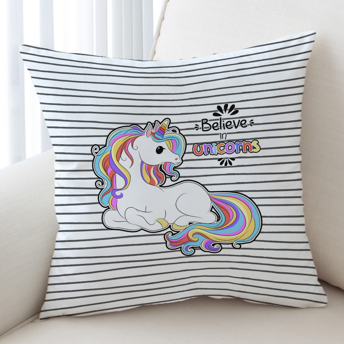 Cute Colorful Unicorn Stripes Cushion Cover easily changes the look of your space at an affordable price. This decorative cushion cover has a square shape with popular sizes and impressive prints that can easily be decorated with many styles.